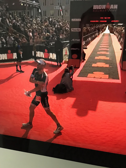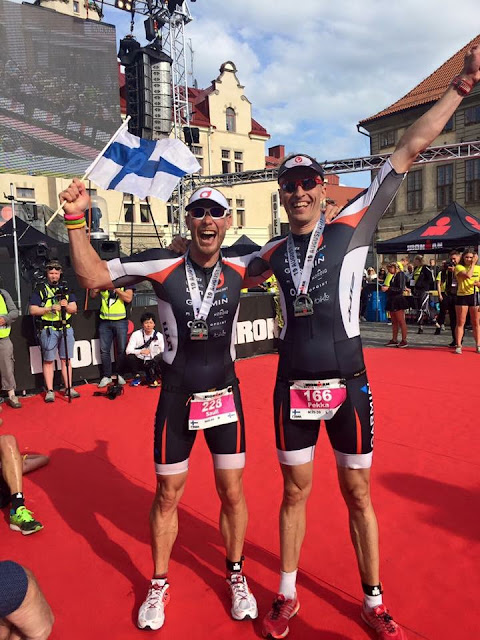 Juoksuun aivan pakasta vedetyillä Sompilta ostetuilla Newtoneilla. Juoksu rullasi ja aattelinkin kokoajan, että liian kovaa mennään. Pekka saavutti pikkuhiljaa ja huusi takaa ‘jätkä on oppinut juoksemaan’! Kisakuulumiset 40 sekunnissa ja Pekka meni menojaan. Tossu kuitenkin nousi mullakin. Tokalla kiekalla tuli pari huonoa kilsaa kaupungin kortteleissa kun vähän fiksailin geelejä. 3:lle lähdettäessä omahuollon kohdalla vaimo löi viimeiset eväät käteen ja huusi, että kiristä vähän ja hyvin menee! Sisäinen naurunremakka soi kun aattelin kiristämistä… seuraava kilsa olikin taas napakka… ja sitten totesin, että en mä turhaan oo treenannut ja tykitin niin paljon kuin jaloista irtos. Vauhti oli minulle hyvää. Kaikki ongelmat polvissa ja yms ei tuntunut miltään ja aloin hokea mantraa minkä Lemmettylä oli Pekalle sanonut! Äkkiä pois sieltä radalta! Ohituskaistaa mentiin, kaikki hitaammat oli jo radalla. Sitten ohiteltiin uberbikereita, jotka kosahti viimeiselle kympille. Mielessäni oli myös sanat, että 35km maratonmuuri ei sitten koske Ironmanillä, eikä muuten koskenutkaan! Vauhti pysyi, vaikka viimeiset kilsat ovat ikuisuus. Maalisuoralla tajusi, että tänään tehtiin täydellinen kisa! Riemu repesi ja otin kaiken irti, high five juontajalle ja kädet pystyssä maaliin ja suoraan Pekan syliin. Olimme Kalmarin kovimmat Rokkitähdet seuraavan 3 minuutin ajan ja huudatettiin yleisöä. Pekka oli 2. ja meikä 7. Pekan unelma Konasta oli vihdoin 10 Ironmanin jälkeen totta. Fiilis oli käsittämätön, perhekin tajusi, että tänään kaikki natsas ja unelma on enää huomisen slottiawardsin ja tähden asentojen päässä! Maraton 3:31 ja kokonaisaika uusi PB 9:27.