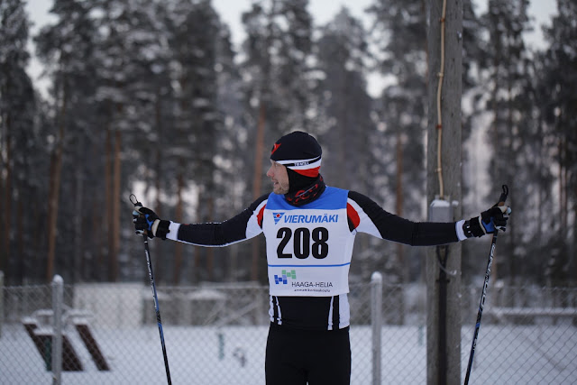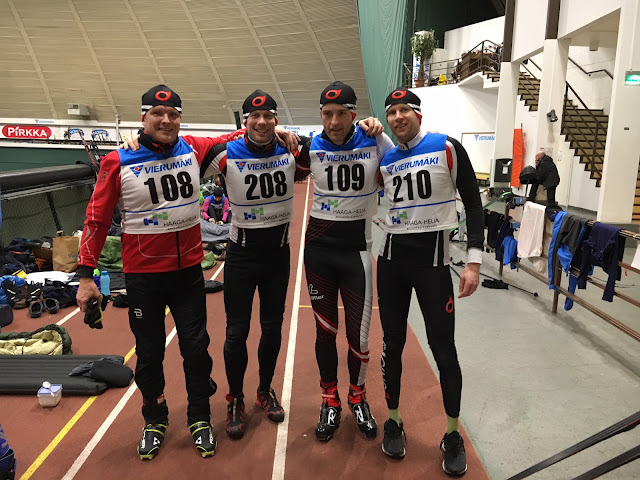 Antti kuitenkin houkutteli vanhan Korvenkylän (Korven Honka, KOHO) jengin mukaan 8 hengen (lopulta 7, kun tuli yksi loukkaantuminen) tiimiin. Loukkaantumisen jälkeen oli tavallaan eka mahis vähän päästä irroittelemaan kehosta höyryjä pois. Tammikuun alusta treeni on taas kulkenut ja kuntoutus pikkuhiljaa jäänyt. Perus triathlontreenin päälle kävin pikkusen paukuttelemassa hiihtoja etelä Suomen tykkipätkillä. Oli taas unohtunut kuinka hemmetin hauskaa hiihto on! Sää on kuitenkin pitänyt meitä Helsingissä otteessa ja sadetta tuulta, loskaa ja pimeyttä koko rahalla. Vähän niinkuin fillarissakin kevään ulkokauden alkaessa on saatava hiihdossa ns. karstat irti koneesta. Viime hetkellä hiihto alkoi taas tuntua hiihdolta ja suksi luisti mukavasti viimeistelyssä Leppävaaran uudella sprinttiradalla.