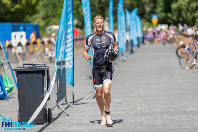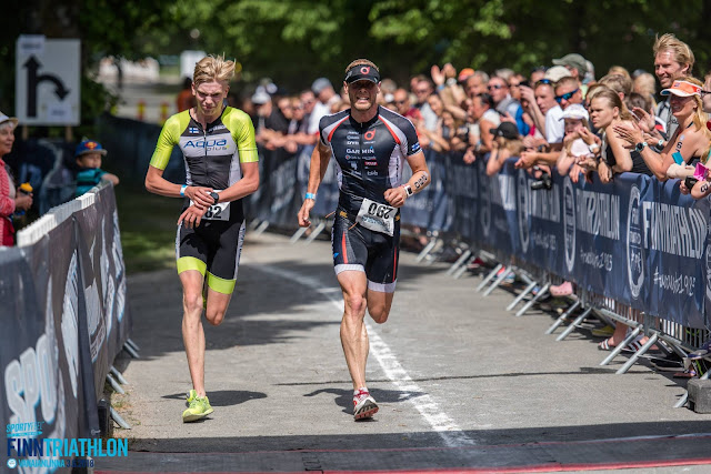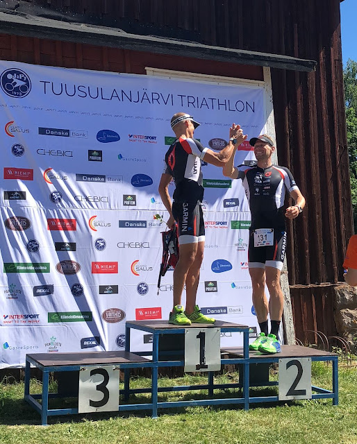 Uinnissa olikin harvinaisen väljä ja eturiviin ei ollut tunkua ollenkaan. Teron kanssa taas vuoroveto hommiin, paitsi tokalla kiekalla jotenkin henki salpautui ja en pystynyt hoitamaan omaa settiäni. Roikuin hampaat irvessä jaloissa ja lopussa kuitenkin pääsin taas rinnalle ja 2. pääsin T 1:lle. Nopee vaihto ja siitä kärkeä kiinni ajamaan. Käytännössä tokan mutkan jälkeen alle 5km ajetti niin ohi kärke. Vedettiin laillisella distanssilla vuorovedoilla aina käännöksissä vaihdot ja 320-330W tavoitetehona. Kolmonen roikkui sitkeesti kiinni letkassa ja tokan kierroksen alussa päätettiin laittaa hanaa ihan kunnolla. Eka veti Tero 400W ja sitten meikä ohi ja muutama minuutti samaa rallia ja homma selvä. Heiti T1:ltä lähtiessä tajusin, että juomapullon pilli oli jäänyt laukkuun ja juomat jäi juomatta. Nestehukka ei ollut ongelma, mutta suuta kuivasi niin pirusti. Tokalla fillarikiekalla se sitten onnkesi vähän helpotti. Hyvin sai ajettiin kovilla tehoila pyörän loppuun, jossa meikällä ei ollut muuta mielessä kuin juomapullo! Keskari 42,3km/h ja 342NP tehot. Nopee T2:n ja pullo mukaan ja suuta hoidattamaan taas juoksu iskuun. Tero meni menojaan ja juoksussa ei mitään saumaan. 2km jälkeen oli selvää myöskin, etä hölkkä maaliin riittää, kun takana ei ollut enää uhkaajaa. Perusvedolla maaliin ja kaksoisvoitto SKB:lle ja mutenkin jätkien kokonaispanos todella huikea!