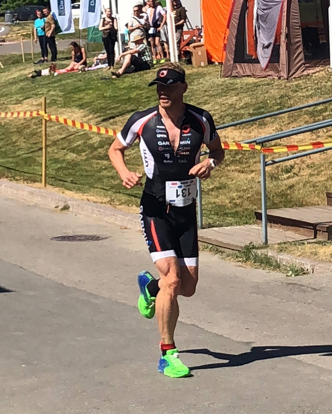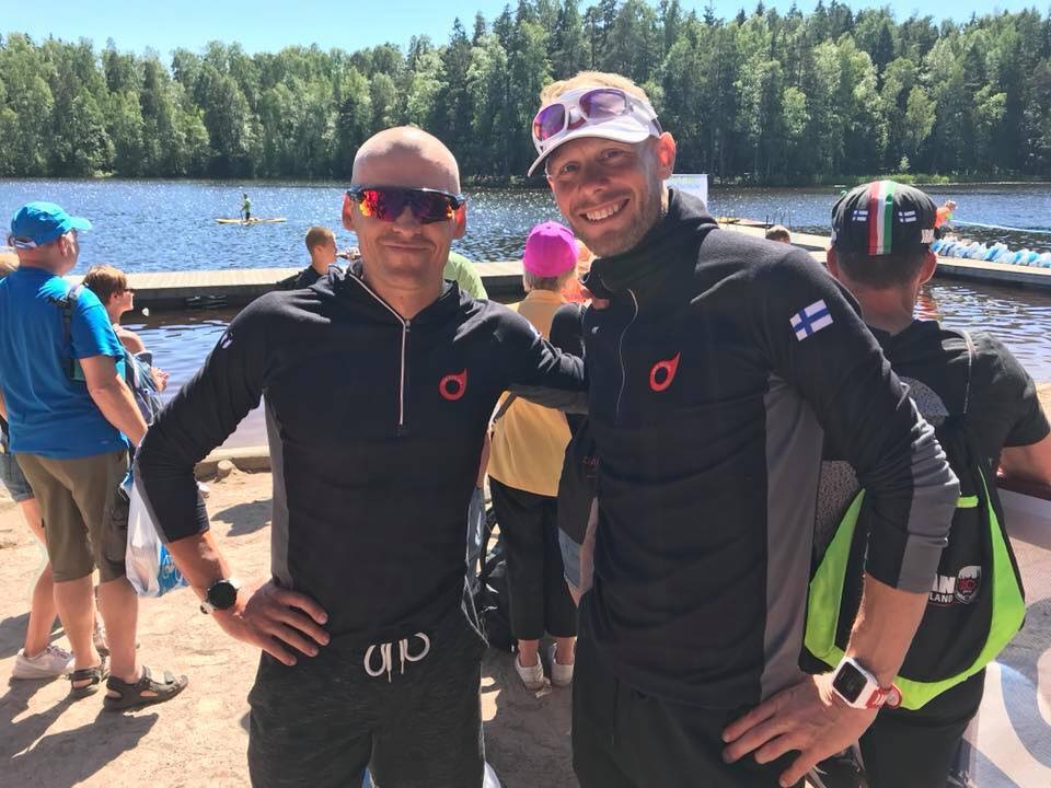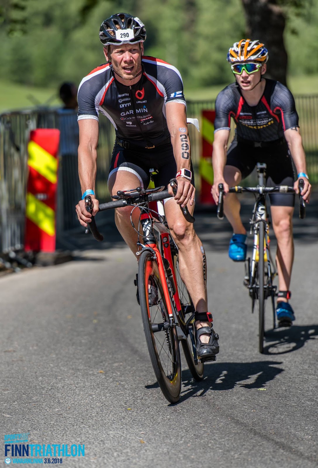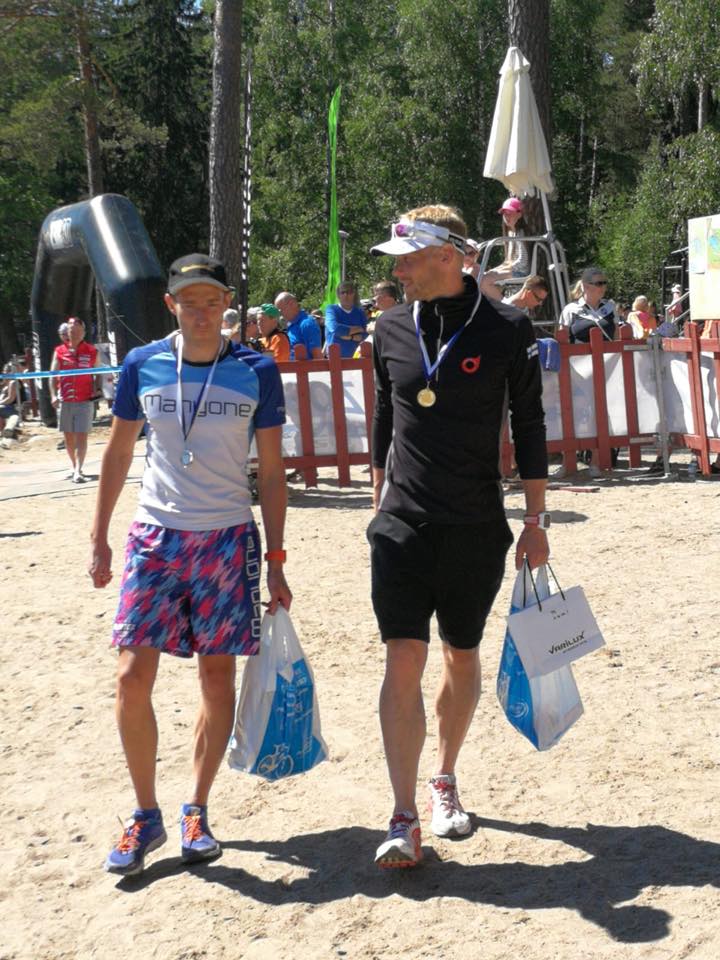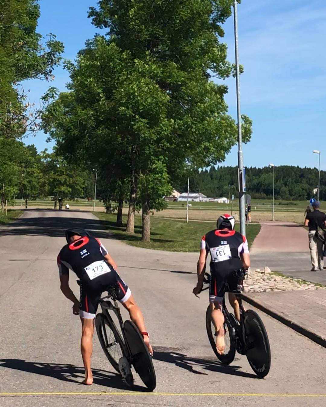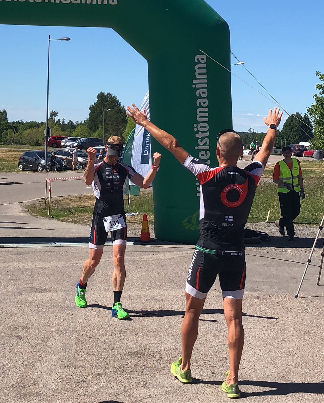 Uinnissa olikin harvinaisen väljä ja eturiviin ei ollut tunkua ollenkaan. Teron kanssa taas vuoroveto hommiin, paitsi tokalla kiekalla jotenkin henki salpautui ja en pystynyt hoitamaan omaa settiäni. Roikuin hampaat irvessä jaloissa ja lopussa kuitenkin pääsin taas rinnalle ja 2. pääsin T 1:lle. Nopee vaihto ja siitä kärkeä kiinni ajamaan. Käytännössä tokan mutkan jälkeen alle 5km ajetti niin ohi kärke. Vedettiin laillisella distanssilla vuorovedoilla aina käännöksissä vaihdot ja 320-330W tavoitetehona. Kolmonen roikkui sitkeesti kiinni letkassa ja tokan kierroksen alussa päätettiin laittaa hanaa ihan kunnolla. Eka veti Tero 400W ja sitten meikä ohi ja muutama minuutti samaa rallia ja homma selvä. Heiti T1:ltä lähtiessä tajusin, että juomapullon pilli oli jäänyt laukkuun ja juomat jäi juomatta. Nestehukka ei ollut ongelma, mutta suuta kuivasi niin pirusti. Tokalla fillarikiekalla se sitten onnkesi vähän helpotti. Hyvin sai ajettiin kovilla tehoila pyörän loppuun, jossa meikällä ei ollut muuta mielessä kuin juomapullo! Keskari 42,3km/h ja 342NP tehot. Nopee T2:n ja pullo mukaan ja suuta hoidattamaan taas juoksu iskuun. Tero meni menojaan ja juoksussa ei mitään saumaan. 2km jälkeen oli selvää myöskin, etä hölkkä maaliin riittää, kun takana ei ollut enää uhkaajaa. Perusvedolla maaliin ja kaksoisvoitto SKB:lle ja mutenkin jätkien kokonaispanos todella huikea!